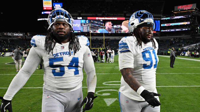 Nov 16, 2025; Philadelphia, Pennsylvania, USA; Detroit Lions defensive tackle Alim McNeill (54) and Detroit Lions defensive tackle Tyleik Williams (91) react after the game against the Philadelphia Eagles at Lincoln Financial Field.