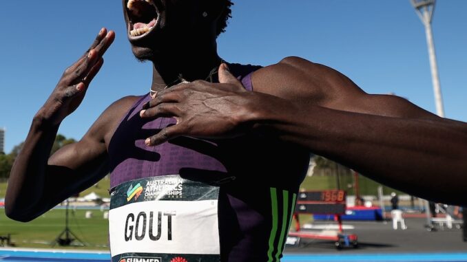 Gout Gout of Queensland celebrates after breaking the World Junior Record and Australian Record and a PB to win the Men’s 200m final in 19.67 seconds during the 2026 Australian Athletics Championships at Sydney Olympic Park Athletic Centre on April 12, 2026 in Sydney, Australia. (Getty Images: Cameron Spencer)